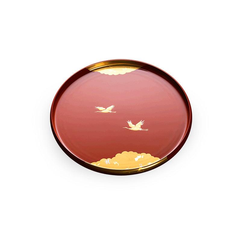 This elegant Red Japanese Lacquer Tray, adorned with graceful golden cranes, symbolizes longevity and good fortune in Japanese culture. The tray is made with high-quality lacquer, displaying a rich red color contrasted by delicate gold patterns of flying cranes and clouds. Handcrafted with meticulous care, this tray is perfect for serving tea, desserts, or even as a decorative piece.